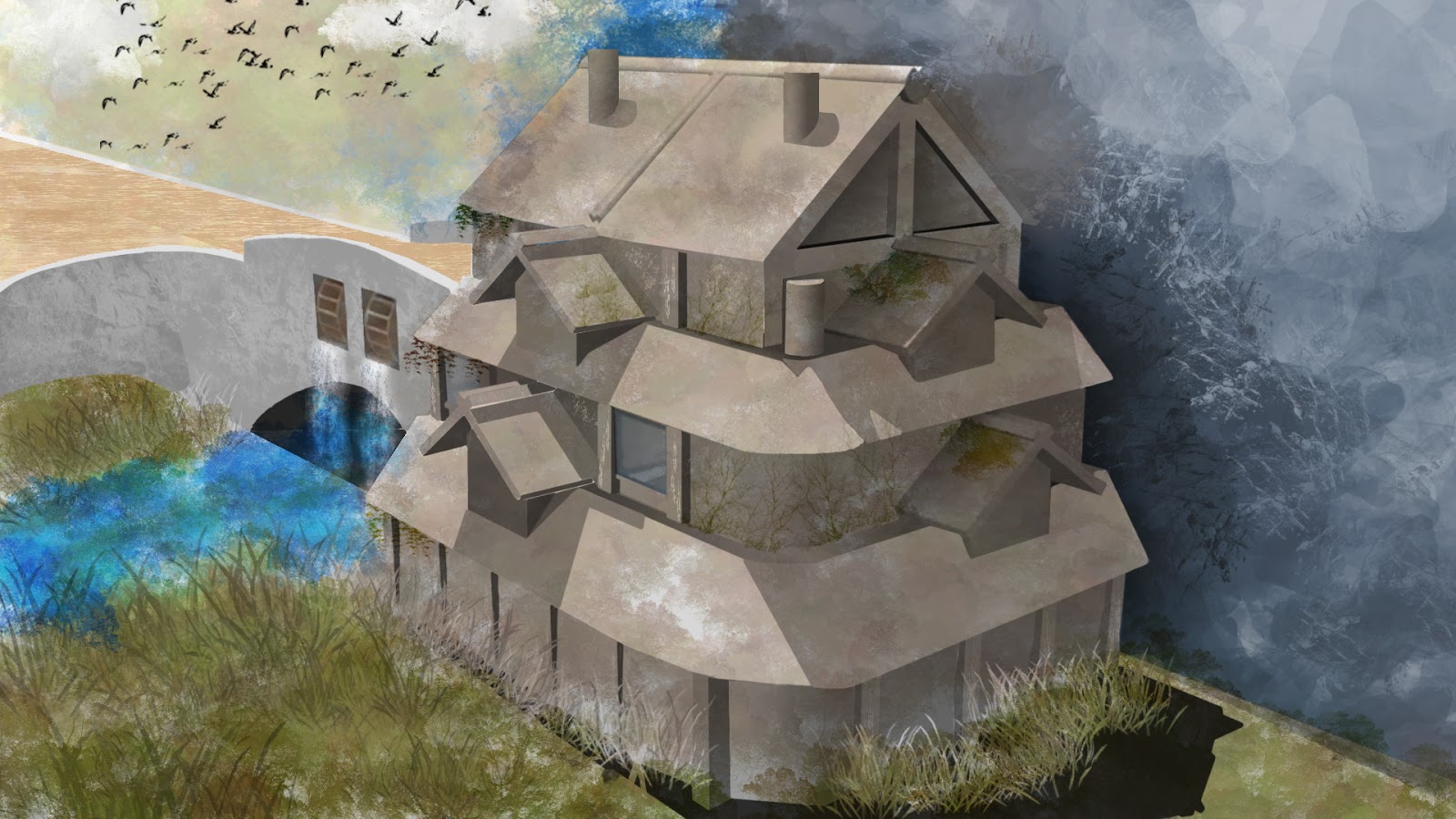 A last minute addition I made to my final piece was that of a palette swap on the roofs of the mill, I feel this better implies the thatched materials of the roofs with colours swinging towards yellows, browns and greens. I also feel the change helps set the narrative of this dilapidated mill with the thatched roofs growing mould in the moist environment of the waterfall.
